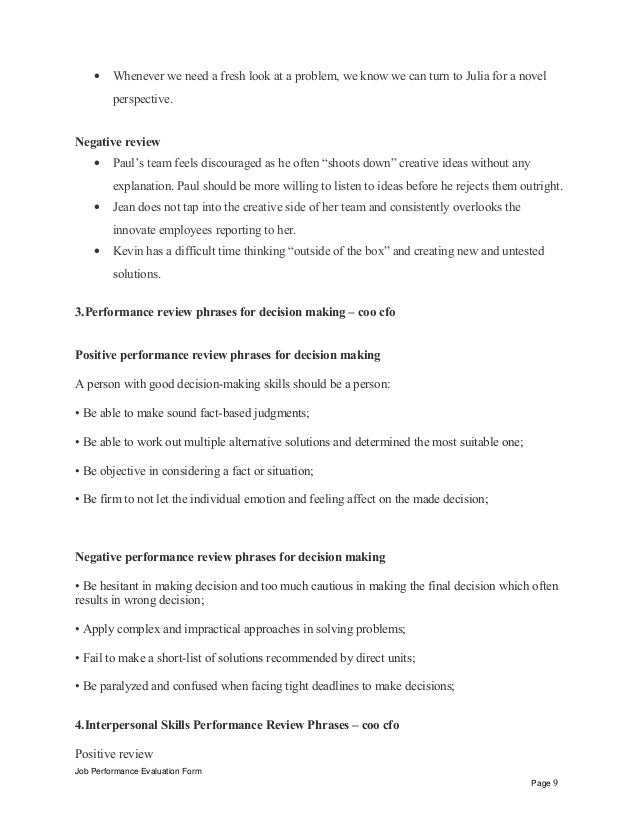 In this section of our free performance review tutorial, you will find several positive and negative creativity and innovation example performance review phrases. Positive Phrases. How to Write a Great Performance Review Getting Tough Subjects Out in the Open ... Get Document